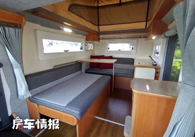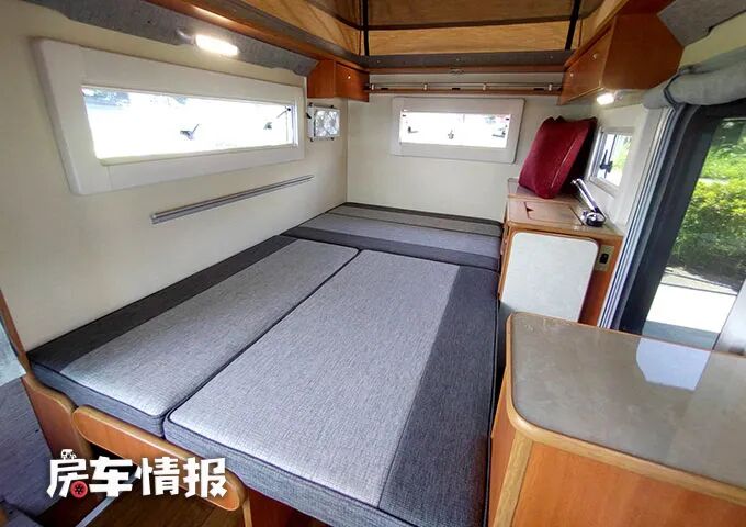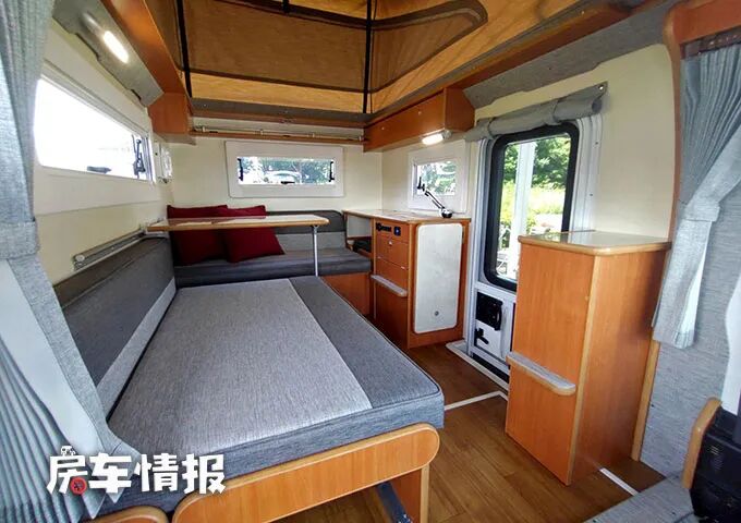 刚才我们也说过顶部还带有可以升起的顶棚,所以当有更多的睡眠需求时,也可以选择升顶内的双人床,如此一来,整辆车虽然程度不足4米,但是能够满足四个人的睡眠需求。