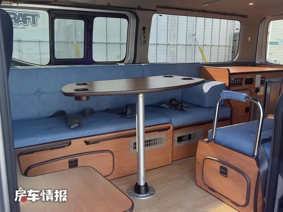 车内的布局较为简单,进入车厢内部就可以看到一排长条的蓝色皮艺沙发,并配置了三条安全带,而乘客门的后方还有一张独立的带有安全的沙发,日常行车时均可乘坐。