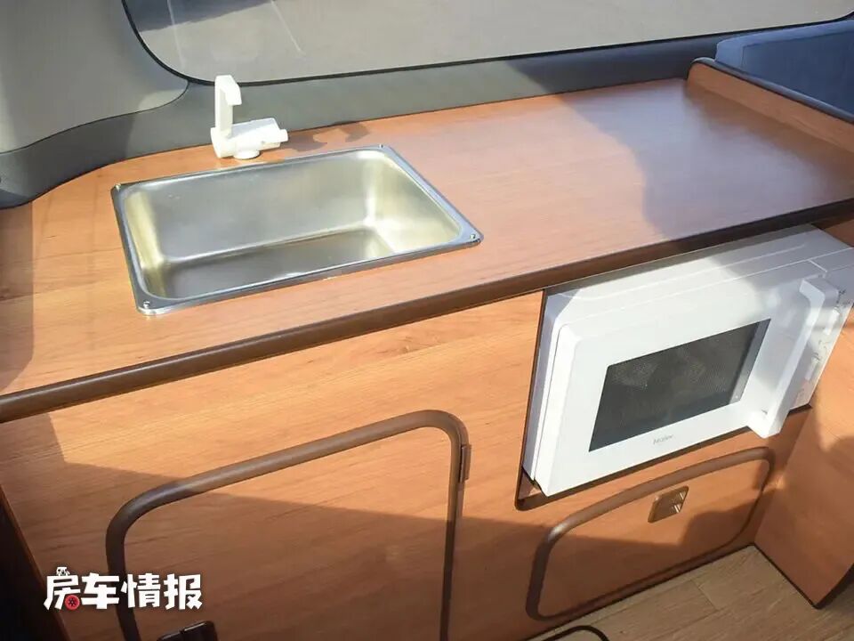 最后是车厢尾部,这款车和其他车型不太相同的是,车尾部设计了一个独立的厨房区域,一左一右两个操作台,一侧的操作台面上提供了不锈钢的水槽,下方带有微波炉,后期可以搭配便携式的卡式炉或者电磁炉,来进行简单的烹饪。
