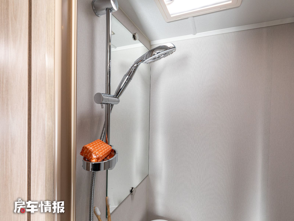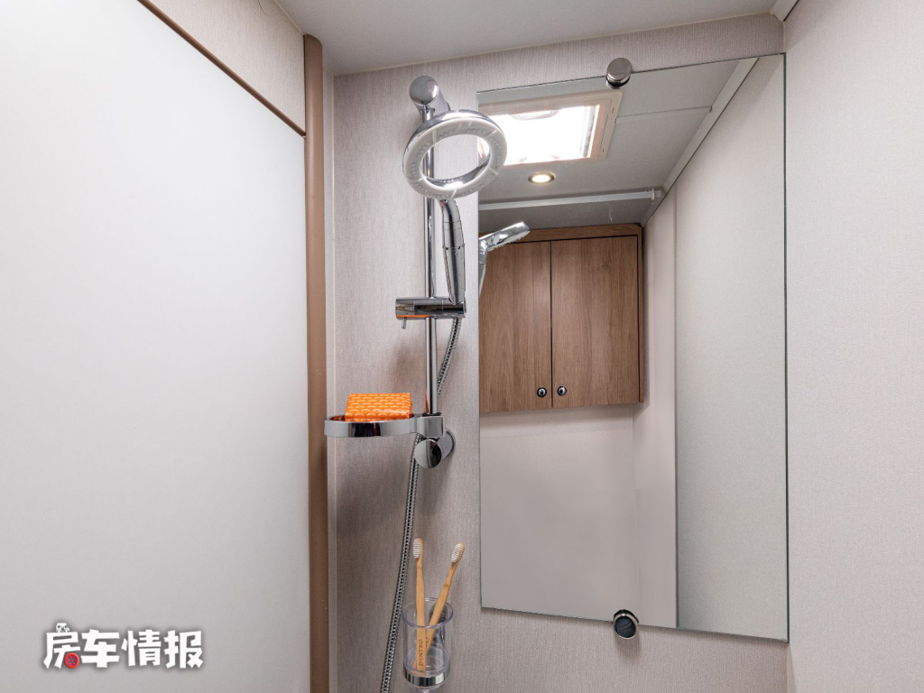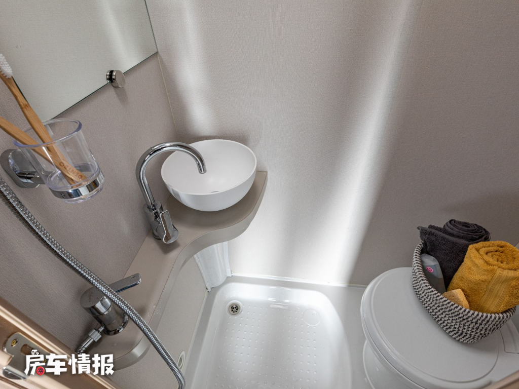 车内卫生间被设置在厨房一侧,内部空间挺大,虽然没有采用进口车上常用的干湿分离设计,但日常使用也不会觉得局促。