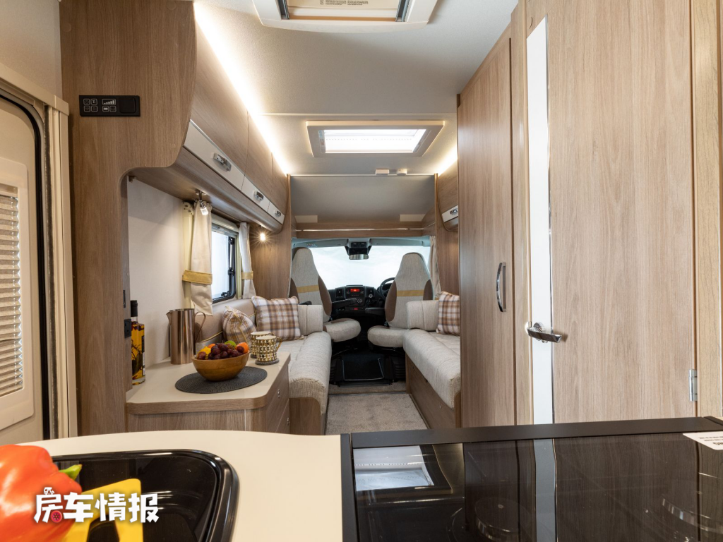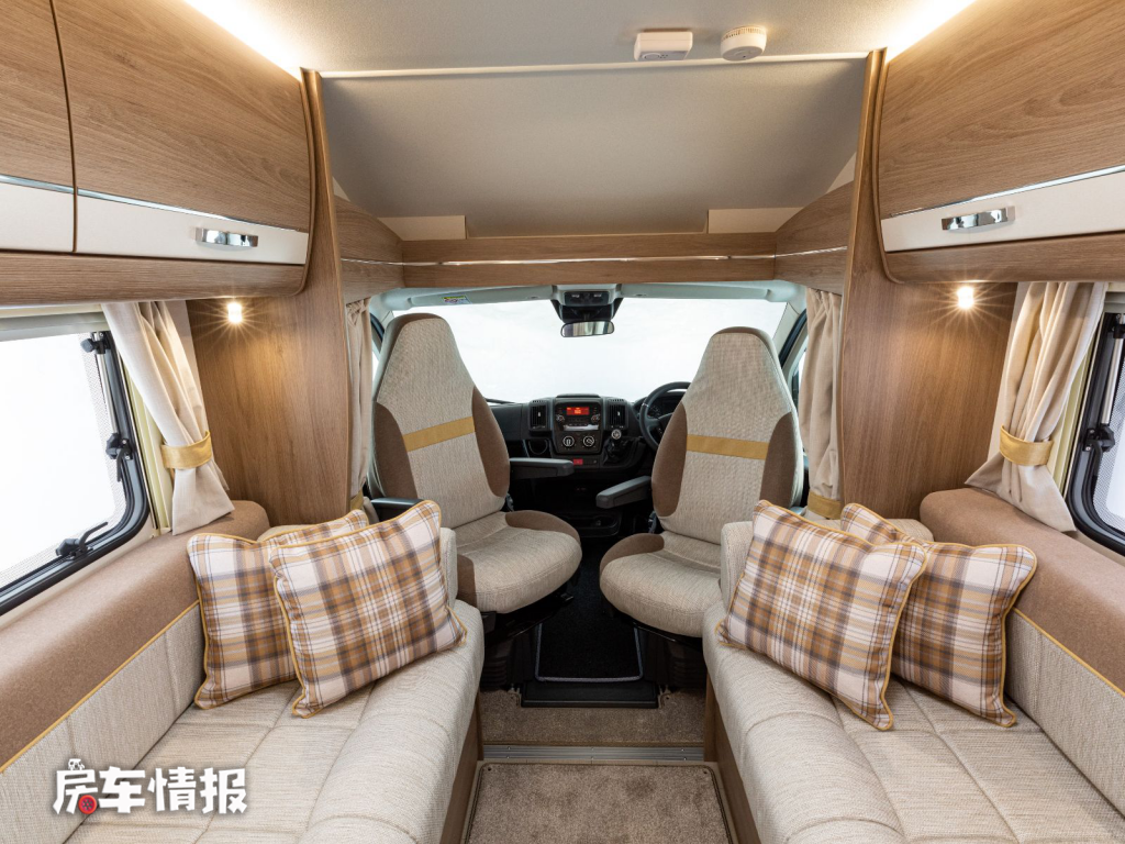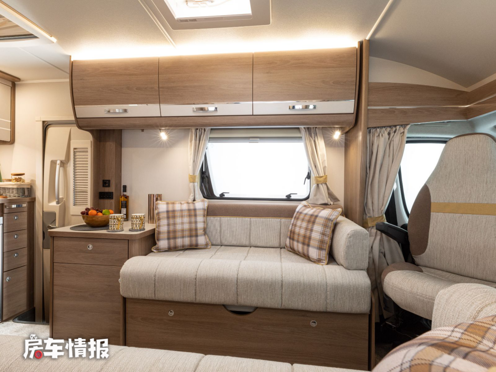 车厢前部并没有提供常见的对坐式沙发或者正向双人座椅,而是布置了一组条形沙发,和国内常见的英国拖挂房车上的座椅比较相似,这种座椅的优点就是乘坐舒适性很好,夜间拼床的时候也方便。