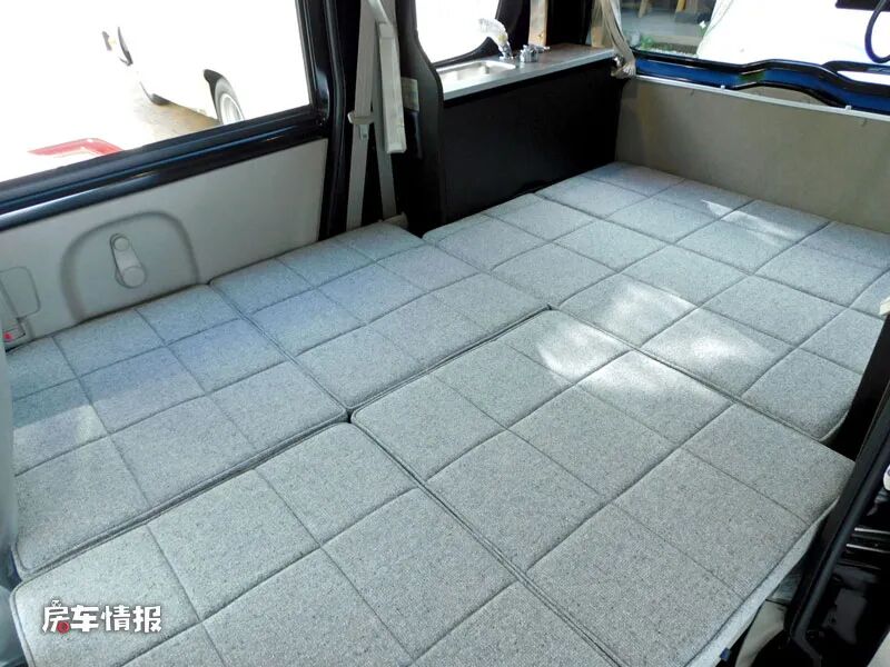 当晚上需要睡觉休息的时候,则可以将前方的乘客座椅翻折向下,把后方提供的床垫铺开,这样一张简单的双人床铺就形成了,虽然不能媲美豪华床铺的舒适度,但是短暂的过夜还是可以的。