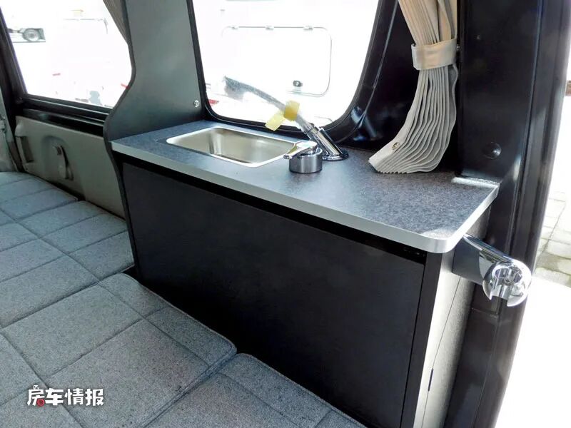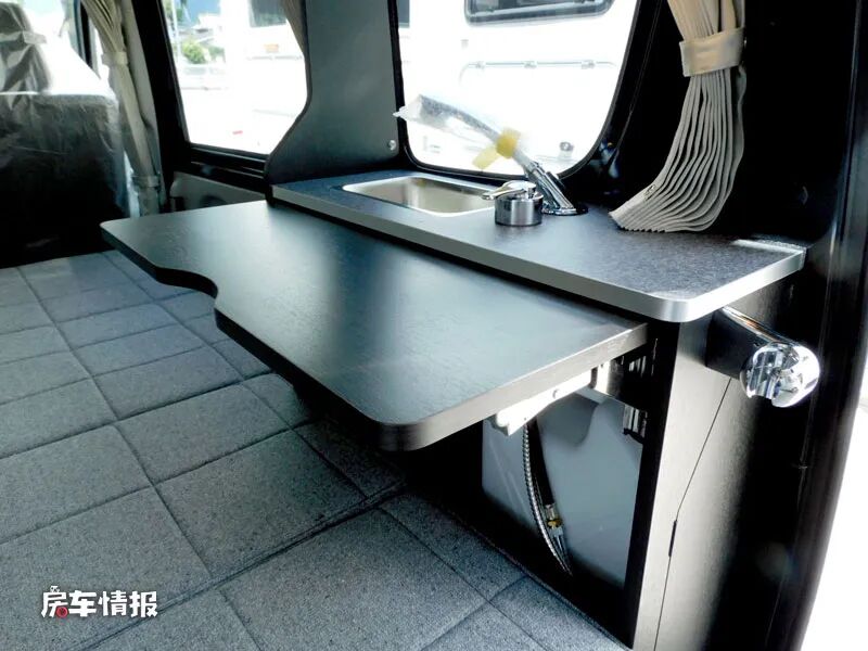 右侧则是一个简易的厨房操作台,台面上提供了基础的盖板不锈钢水槽,旁边的空置桌面则可以后期放置一台便携式的灶台,以满足基本的烹饪需求,另外厨房操作台的水龙头为可抽拉式的,外侧还有能够固定的位置,这样也能够在车尾进行简单的洗漱。