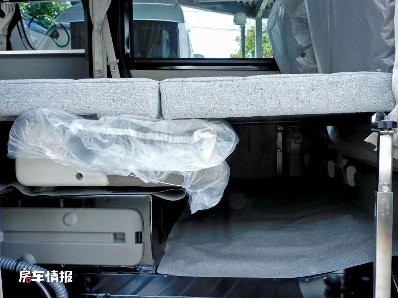 除了基础的厨房操作台,这款车在水电路上也配置了一些基础的容量,包括电路上是提供了300瓦的逆变器,以及一块副电池,水路上则是提供了10升的净水箱和10升的副水箱,不过日本床车的净水箱一般都是便携式的,后期有需要也可以按需去加装。