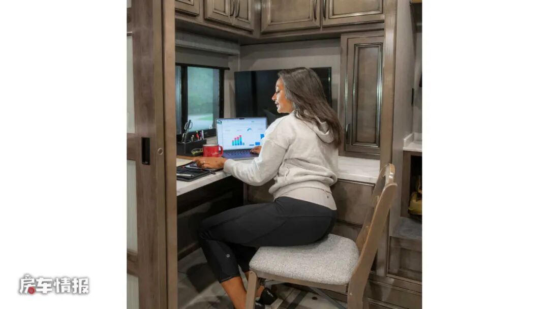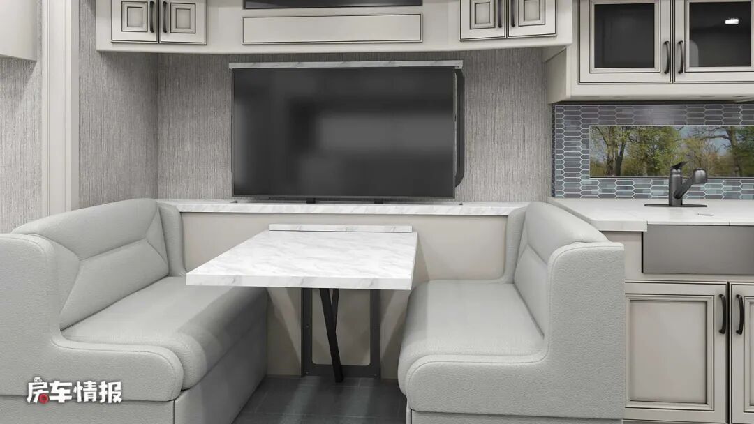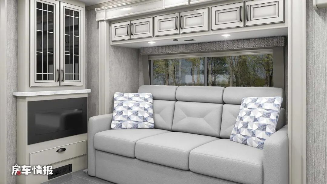 车厢前部的区域是全车的会客区域,一侧是位于小型拓展舱内的长条沙发,旁边还配有壁炉和窗户的设计,十分的有感觉。