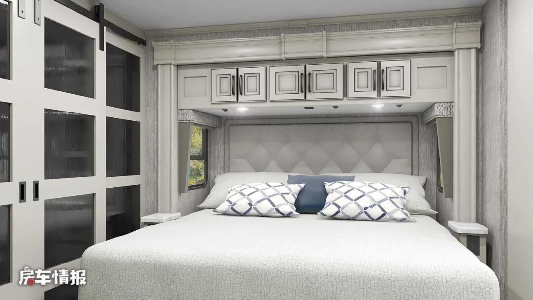 而在车身侧面的另一处拓展舱内的是全车的休息区,床铺的尺寸足以满足两个人的基础睡眠休息需求,床头两侧还有小型的观赏窗,顶部配置了多个储物空间,足以满足日常的生活需求。