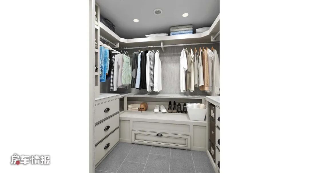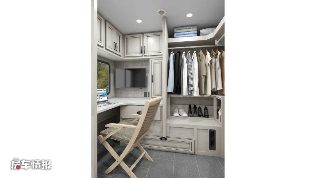 车厢尾部的区域和前方用了一扇窗户门相分隔,看起来有点神秘,其实内部是集合衣帽间和工作间为一起的房间。