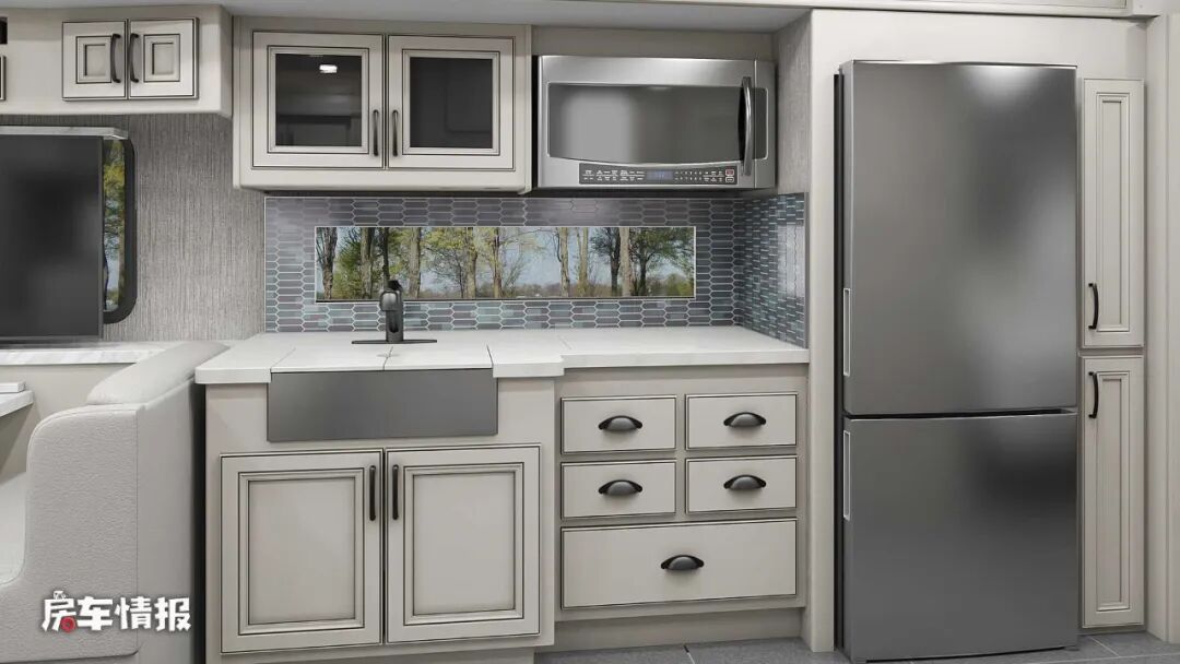 而在就餐区域的后方则是全车的厨房区域,整个操作台的面积还是十分可观的,不仅配有翻盖的洗手台盆、电磁炉,还有微波炉和大容量的双开门冰箱,足够做出一顿美味可口的佳肴。