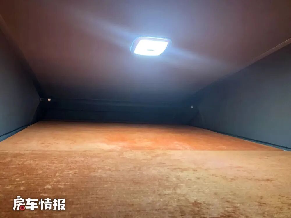 当升起升顶之后,最前方驾驶室的顶部可以呈现出一个类似C型房车额头区域的空间,内部也提供了一张基础的睡床,能够满足两个人睡眠休息的需求。