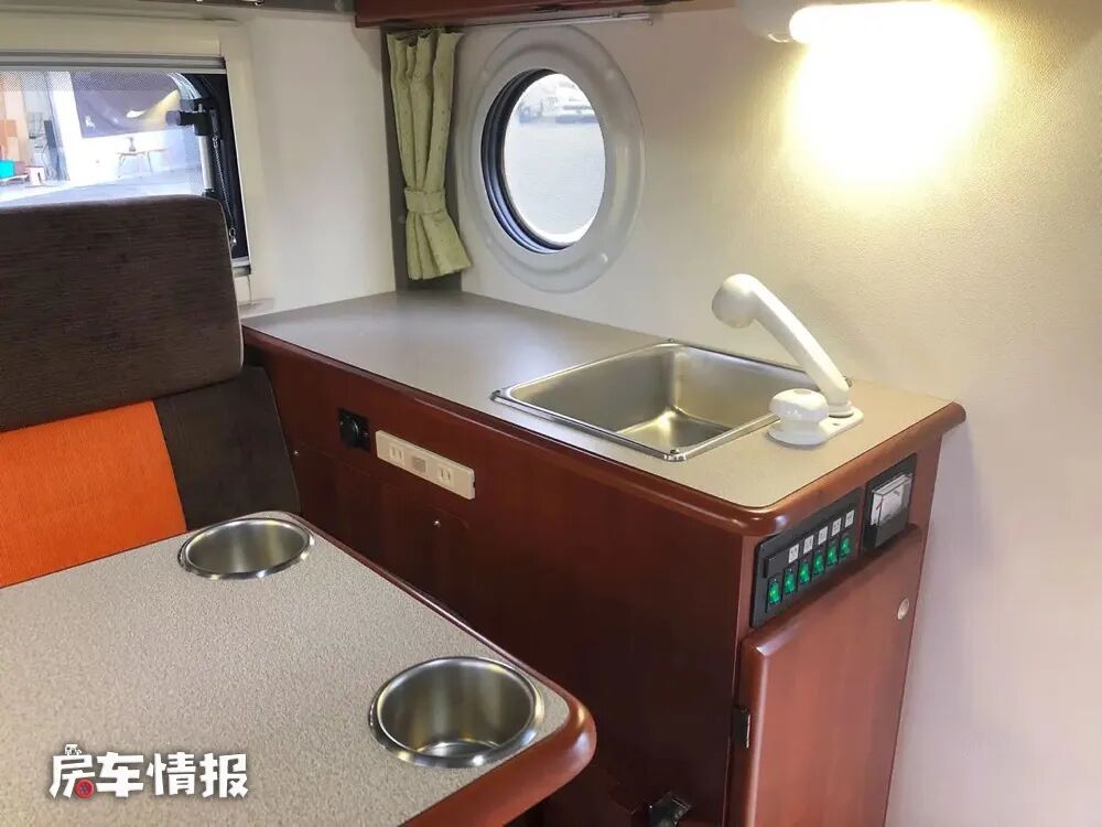 而靠近乘客门的后方,则是设计了一处基础的厨房操作台,台面的尺寸虽然不是特别大,但是外侧还提供了可拓展的桌板,台面上带有不锈钢的水槽,以及抽拉式的水龙头,不仅能够在车内使用,还能够拉到车外进行冲洗,而在旁边的空置区域则需要放置一台便携式的灶台,就能够满足基础的烹饪需求了。