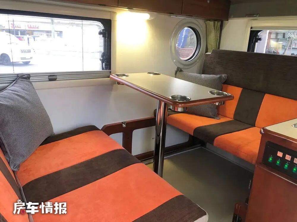 车厢内部则是设计了相对的两排长条座椅,中间匹配一张小型的可移动餐桌,也能够解决日常生活中基本的就餐需求。