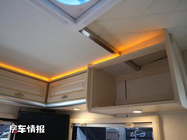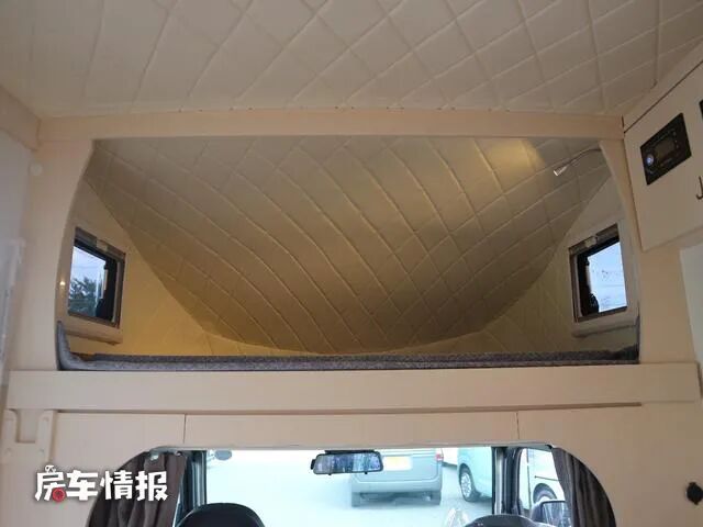 在最前方驾驶室的顶部,是一张抽拉式的额头床,额头床的纵向空间虽然比不过国内C型房车的宽敞,但是基础的睡眠需求还是能够满足的,而且两侧也增加了外推窗,相比之前介绍过的大多数为全封闭的额头区,整体来说不论是采光还是通透度都是比较不错的。