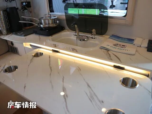 车厢内部的布局则较为简单,采用了日本主流微卡床车的内部设计,靠乘客门这一侧是一张贯通到车厢尾部的厨房操作台,台面采用了大理石的设计,看起来更加的精致,配有基础的水槽,而旁边的空置区域则可以用来备菜或者放置一台便携式的灶台,以满足简单的烹饪需求,下方还嵌入了一台小型的车载冰箱,能够存放一些基础的食材。