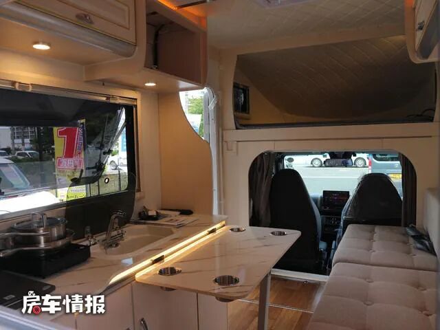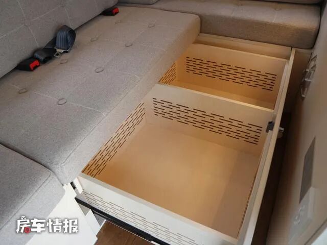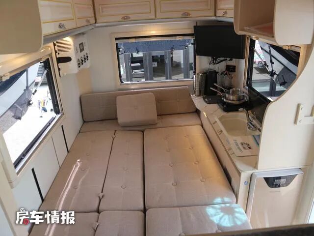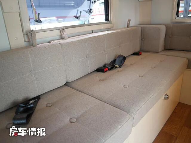 与之相对的是一张带有靠背的长条沙发,整体的坐垫厚度还不错,日常乘坐时也能带来比较舒适的感觉,当驻车的时候,只需要将对面操作台的外侧连接上一台可移餐桌,就能够满足基础的就餐需求了。