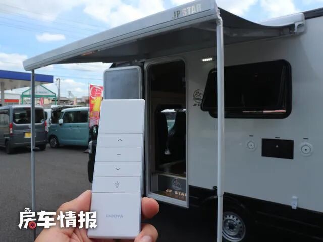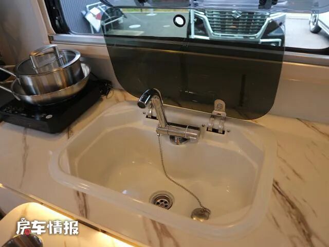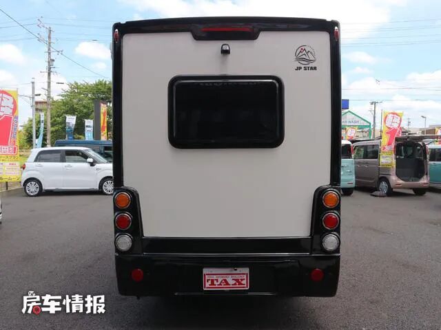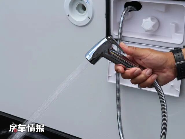 全车采用了黑白拼接的配色,车头和额头为黑色,厢体则为白色,非常有现代感,车身左侧是提供了一个电动的遮阳棚,相对于手动的遮阳棚,它使用起来的便利度更高,更容易操作,另外还提供了一个外置的淋浴花洒,方便日常使用。