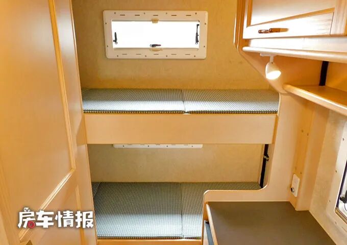 最后就是位于车厢尾部的休息区了,整体采用了上下固定单人床的设计,且都带有采光通风的窗户,可以保证两个人在此睡觉休息。