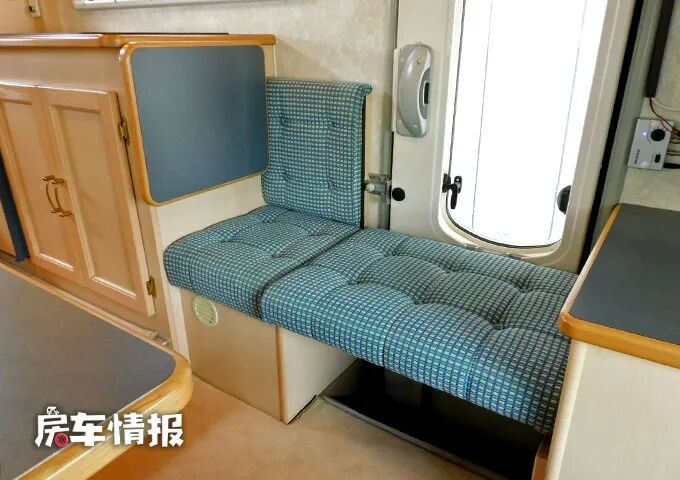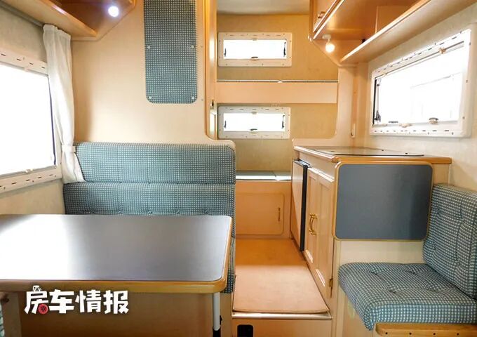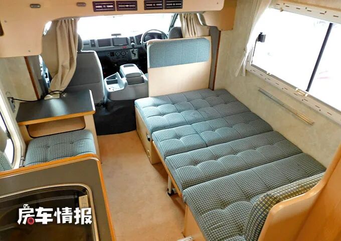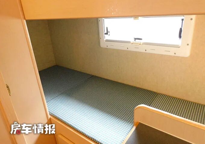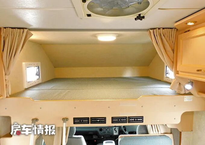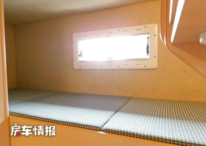 除此之外,在最前方的驾驶室顶部的额头区内,还提供了一张抽拉式的超大双人床,所以整辆车完全能够满足一家人的居住需求。