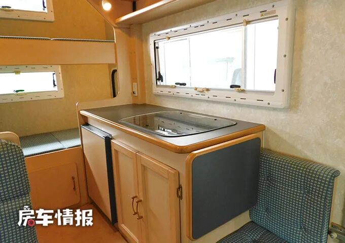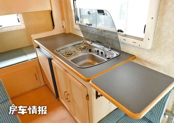 后方则是全车的厨房操作台,整体的面积还是比较不错的,台面上提供了翻盖的不锈钢水槽和双孔燃气灶,旁边的空置区域可以用来连接其他的厨用家电,外侧还带有可以备菜的拓展桌板,下方则是提供了一台65升的单开门冰箱,也能存放一些基础的食材。