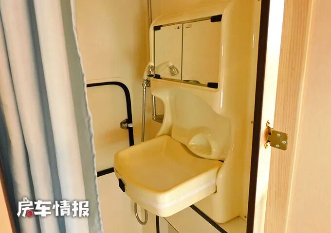 得益于C型房车的设计,在厨房区对面还设计了一间独立的卫浴室,内部不仅提供了便携式的马桶、独立的淋浴花洒,还提供了可翻折的洗手台盆,以及镜面的储物柜,相较于床车来说,这样的设计还是非常实用的。