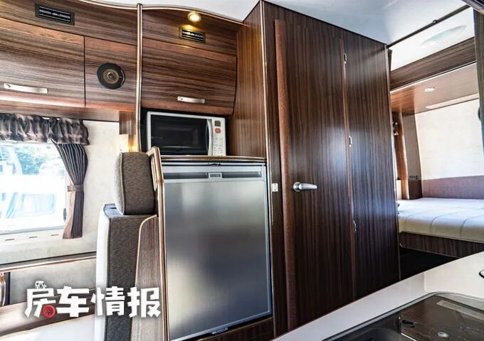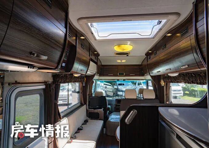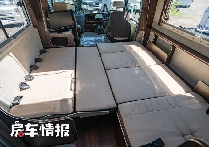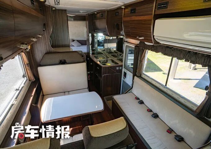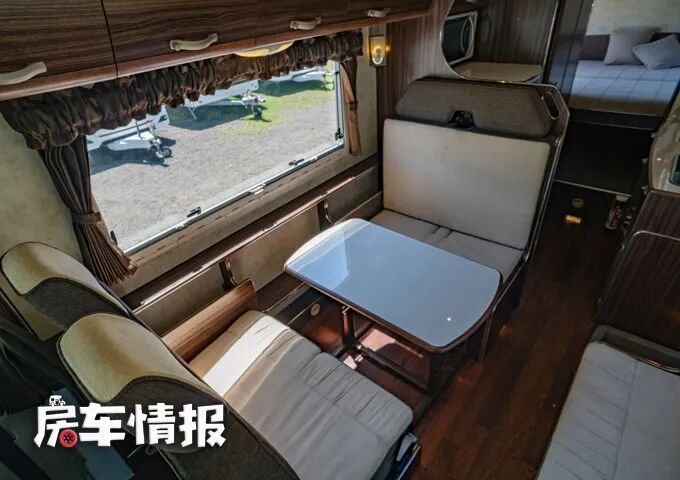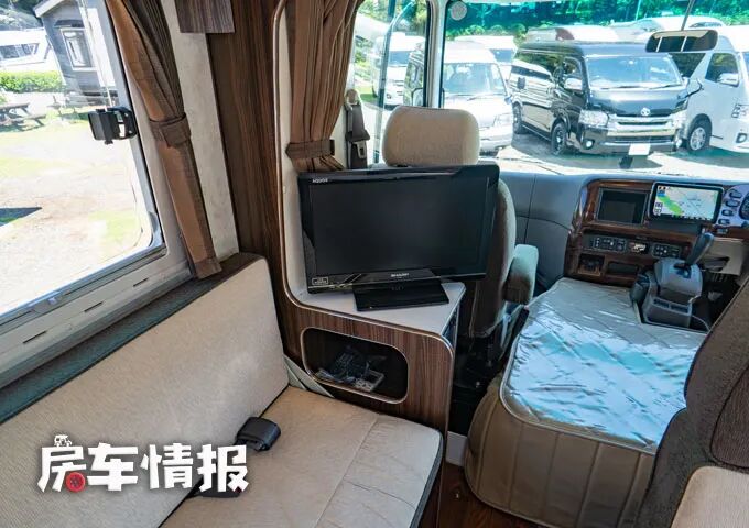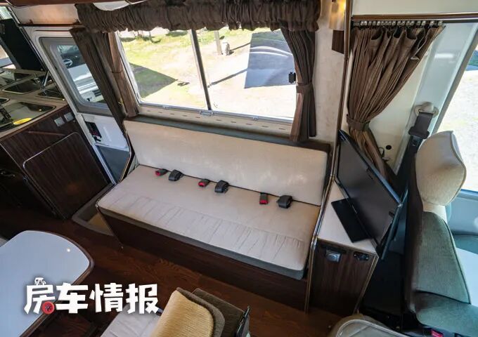 位于驾驶室后方是全车的会客区域,采用了环绕式沙发的设计,配有安全带,日常行车可以乘坐,而且得益于底盘的尺寸,整体的空间也很不错,晚上则可以组合成一张尺寸不错的沙发床,另外还提供了一台19寸的液晶电视,能够提供基础的娱乐服务。