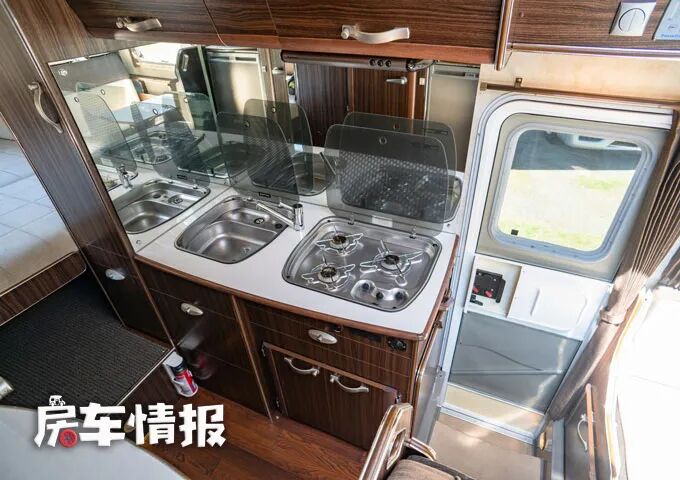 厨房操作台位于乘客门后方,墙壁采用了镜面式的设计,看起来在视觉上有一定的扩容,台面上带有基础的翻盖不锈钢水槽,以及翻盖的三孔燃气灶,可以满足日常的基础烹饪需求。