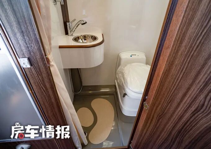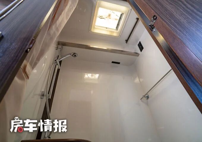 另外这款车还带有一间独立的卫浴室,内部的空间也能够容纳一个人使用,提供了马桶、洗手台盆和淋浴花洒等,能够满足日常基础洗漱和如厕的需求。