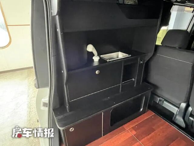 车厢尾部则是集成了全车的主要生活配件,下方还铺设了地板以提升整体尾部的平整性,两侧也各设计了储物立柜。