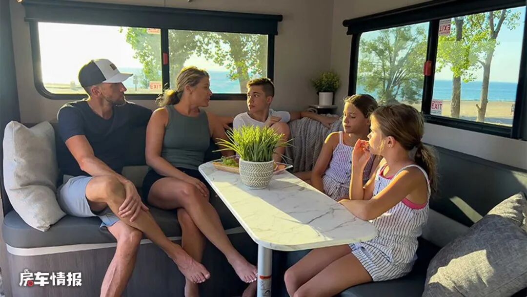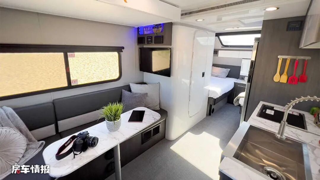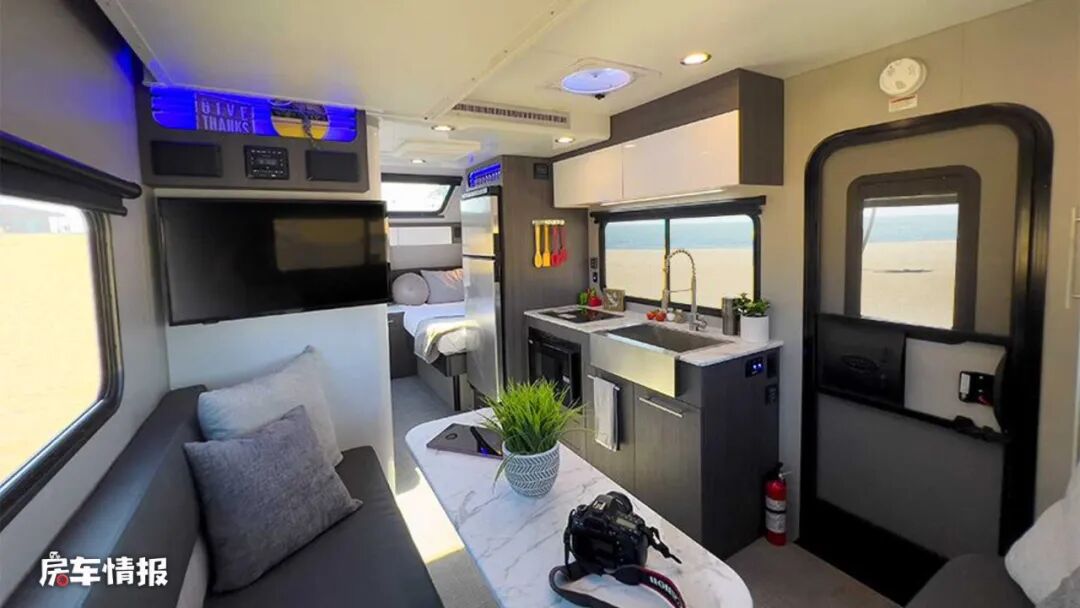车内的空间还是非常不错的,最多能够容纳5个人,车厢前方是主要的会客区域和厨房区域,会客区是由一张L型的沙发座椅和升降餐桌组成的,沙发尺寸够大,足够坐下一家人,而且沙发两侧都设计的是大尺寸的观赏窗,给车内也营造出了比较通透的感觉。另外在侧面墙壁上还提供了一台电视机,可以为平日的旅居生活提供一定的娱乐性。