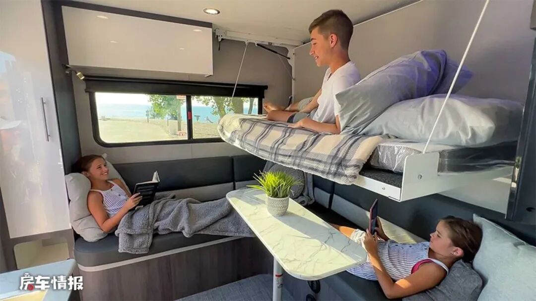 最后就是车厢尾部的休息区,采用了和我们常见的酒店标间设计,一左一右两张单人床,中间还有床头柜可以用来放置手机或者其他小物件,所以整辆车就睡眠空间上,睡下五个人是完全没有问题的。