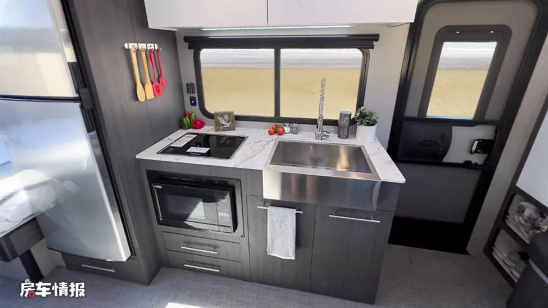 与之相对的则是全车的厨房操作台,台面的尺寸表现的中规中矩,提供了电磁炉、不锈钢水槽、微波炉、上下双开门的冰箱以及储物空间,可以满足日常的烹饪需求。