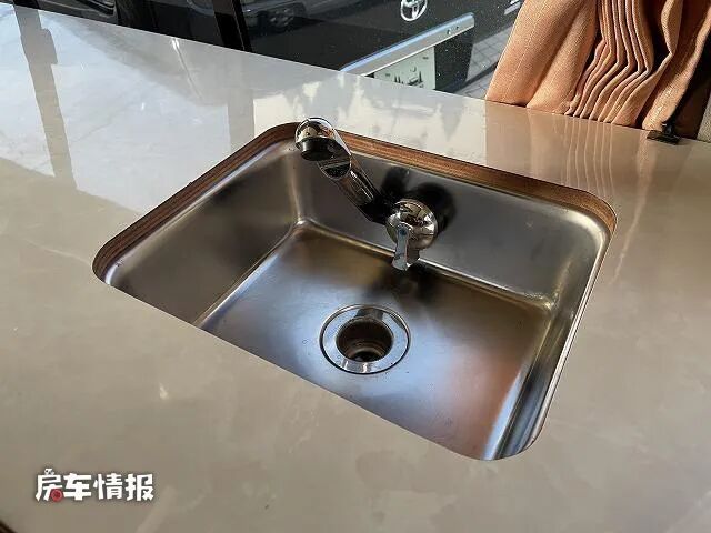 另外一侧则是一张尺寸非常大的厨房操作台,台面上提供了基础的不锈钢水槽,旁边的空置桌面不仅能够用来备菜,后期连接上一台便携式的灶台也能够进行简单的烹饪活动。