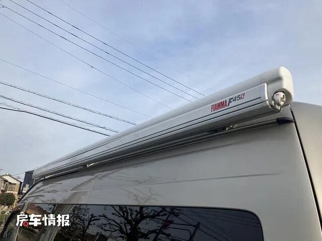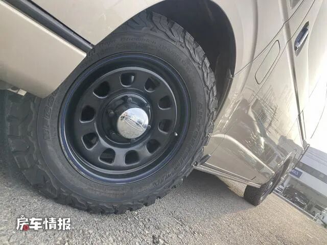 在车身左侧的顶部,全车是配备了一个手动的遮阳棚,后方还提供了登车爬梯,最特别的是整辆车的轮毂都是采用了熏黑的样式,车尾灯也同样是熏黑样式,并且加入了保护框,这样使整辆车看起来都很有运动越野的感觉。