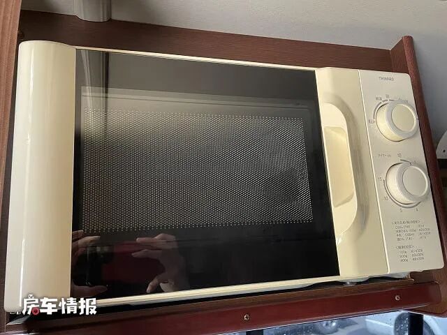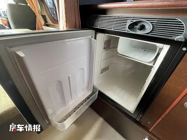台面上方则提供了一台单开门的小型车载冰箱,内部有一个小小的冷冻盒,能够存放一些基础的食材。顶部则嵌入了一台微波炉,平时也可以满足热热饭菜的需求。