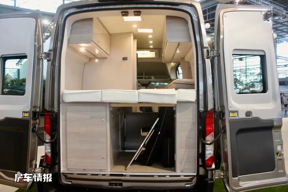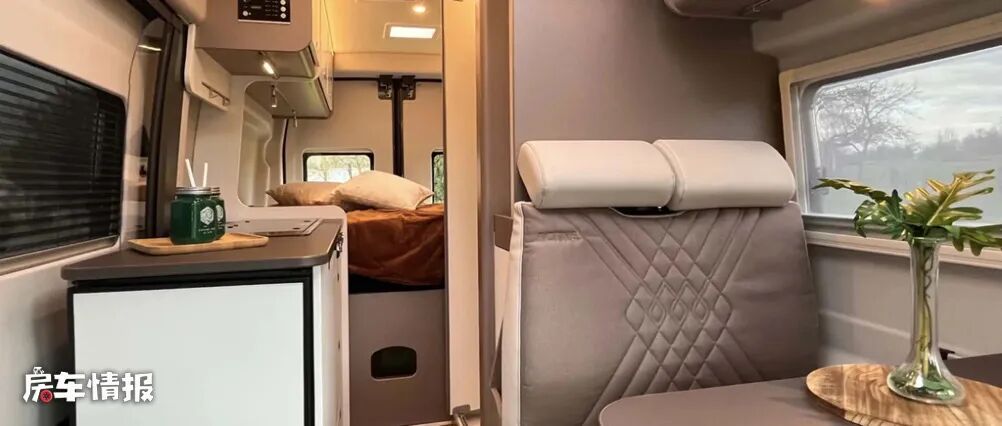 车内的设计其实还是延续了欧美主流露营车的布局,最前方为双人连排座椅沙发+餐桌的会客区域,可以满足日常的就餐需求;靠近乘客门的则是全车的厨房操作台,外侧提供了单开门的冰箱,台面上则是带有翻盖的不锈钢水槽和燃气灶,另外上下方则是提供一些储物空间,能够存放日常物品方便拿取;与其相对的是独立的卫浴室,内部提供了马桶、淋浴花洒等洗漱设施,能够满足在外露营时的基础洗漱和如厕需求;最后则是位于车厢尾部的横置双人床,能够为两个成年提供睡觉休息的地方,不过和国内的B型房车所设计的理念不同,国外的露营车大多数情况下都是专为两个人而设计的,除去有特殊的需求可以加装升降床铺等。