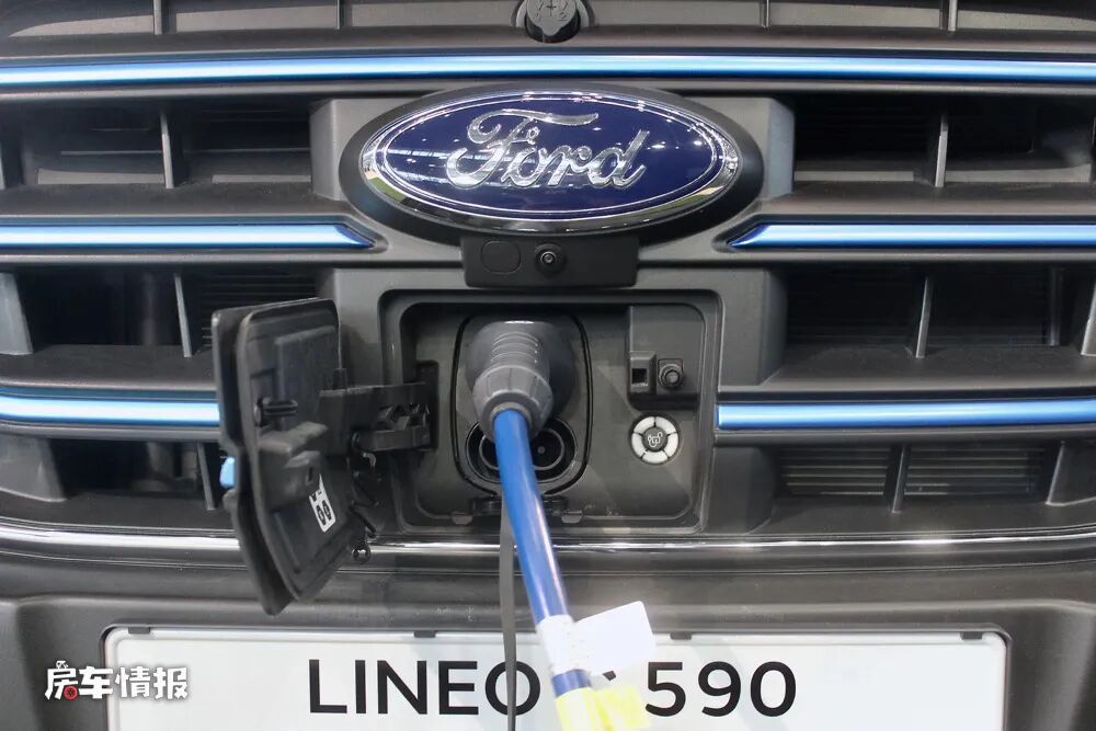 这款搭载福特全顺底盘所打造的纯电露营车,在外观设计上还是比较简约低调的,车身采用比较耐脏的瓦灰色,搭配上一些蓝色的条纹装饰,另外前方的横幅式前格栅也为了呼应车身的彩条,变成了蓝色 ,看起来更贴合纯电环保的理念。