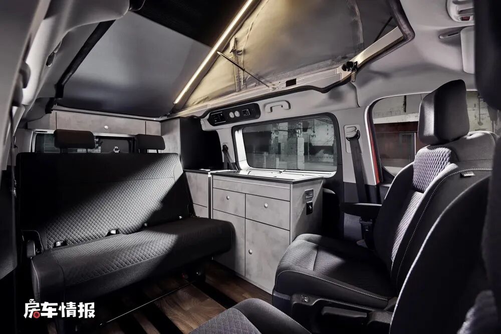 除去主副驾驶座椅,车内还保留了一张沙发座椅,配有安全带,日常行驶过程中,全车可以乘坐5个人,后期有需求也可以选装核载7人的布局,晚上需要睡觉休息的时候可以将前方的主副驾驶座椅与其相互拼接,组合成一张能够容纳两个人使用的沙发床。