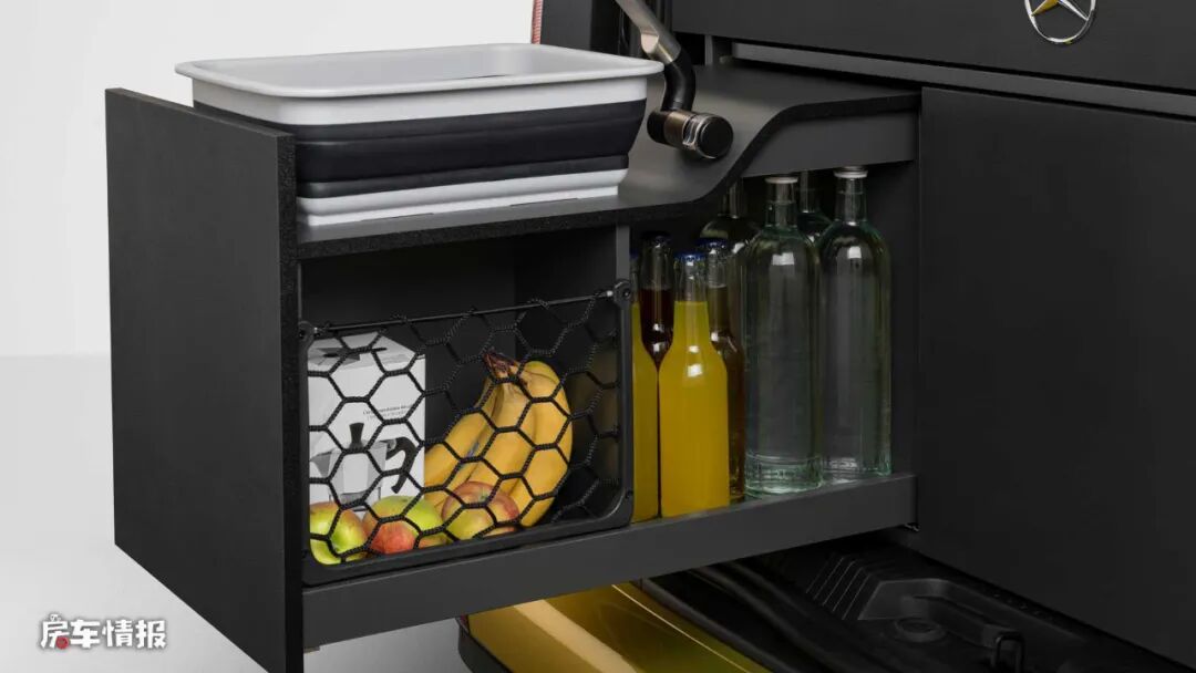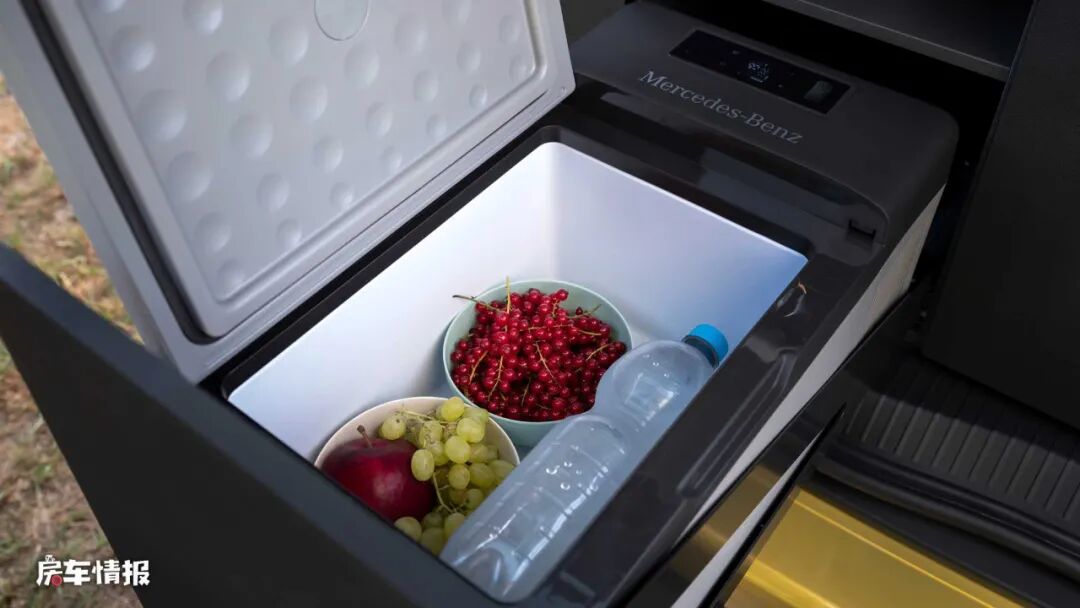 而最中间抽拉出来则是一台小型的翻盖式车载冰箱,虽然容积有限,但是也能够放置一些简单的食材。