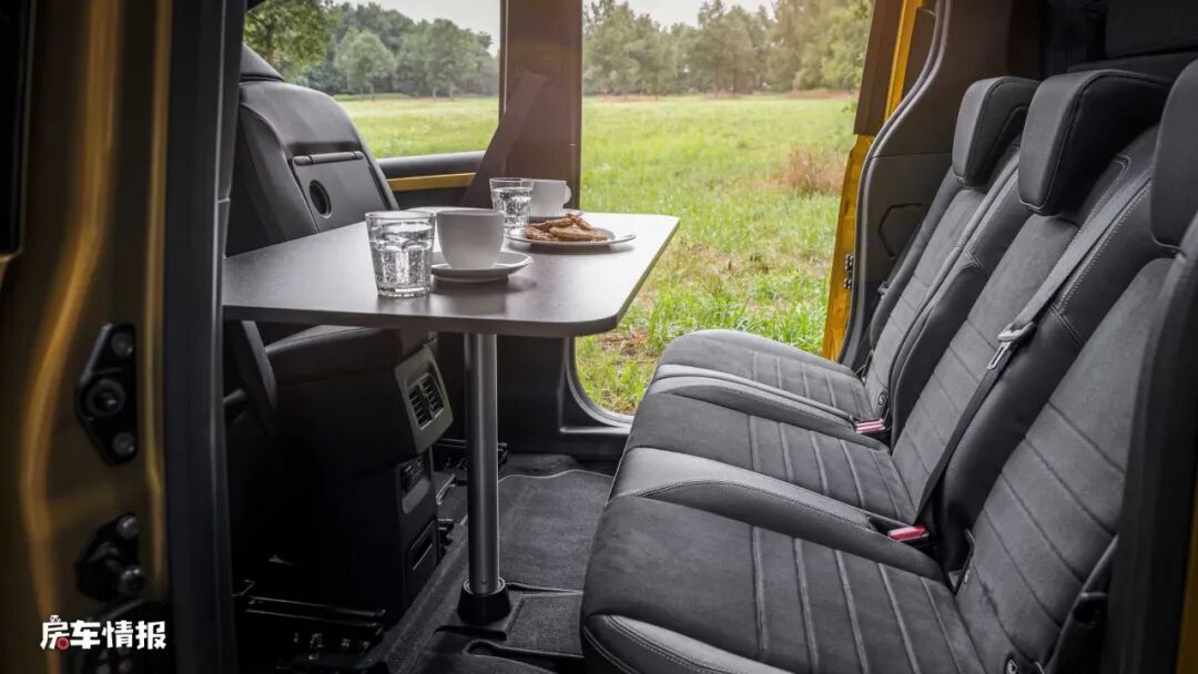 作为一款核载五人的车型,车内提供了一张三人的连排座椅,并配置了安全带,当日常驻车就餐的时候,可以将前方的驾驶室座椅向前倾斜,这样可以为后方提供较宽敞的空间,搭配上一张大尺寸的可移餐桌,能够满足基础的就餐或者办公需求。