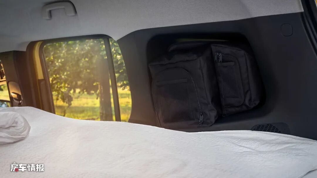 当晚上需要睡觉休息的时候,需要将前方的座椅放倒放平,把后方的床垫铺平整,这样就可以变成一张简易的沙发床了,车尾两侧还带有可以储物的小格子,放置一些贴身的衣物或者行李包也是可以的,虽然是一辆核载五人的车型,但是这辆车只能够满足两个成年人的睡眠需求。