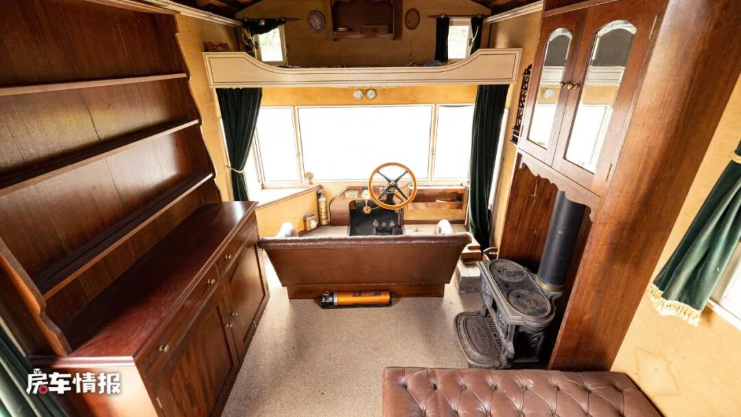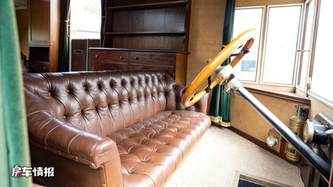 和现在的房车不同,这款车的驾驶室直接连通到后方,整体是采用了三面环绕式观景窗的设计,最特别的是,驾驶座椅是一张长条的皮艺沙发,这要是开车开累了,顺势就能躺下来睡一觉了,不得不说,那个年代的人脑洞也够打开的。