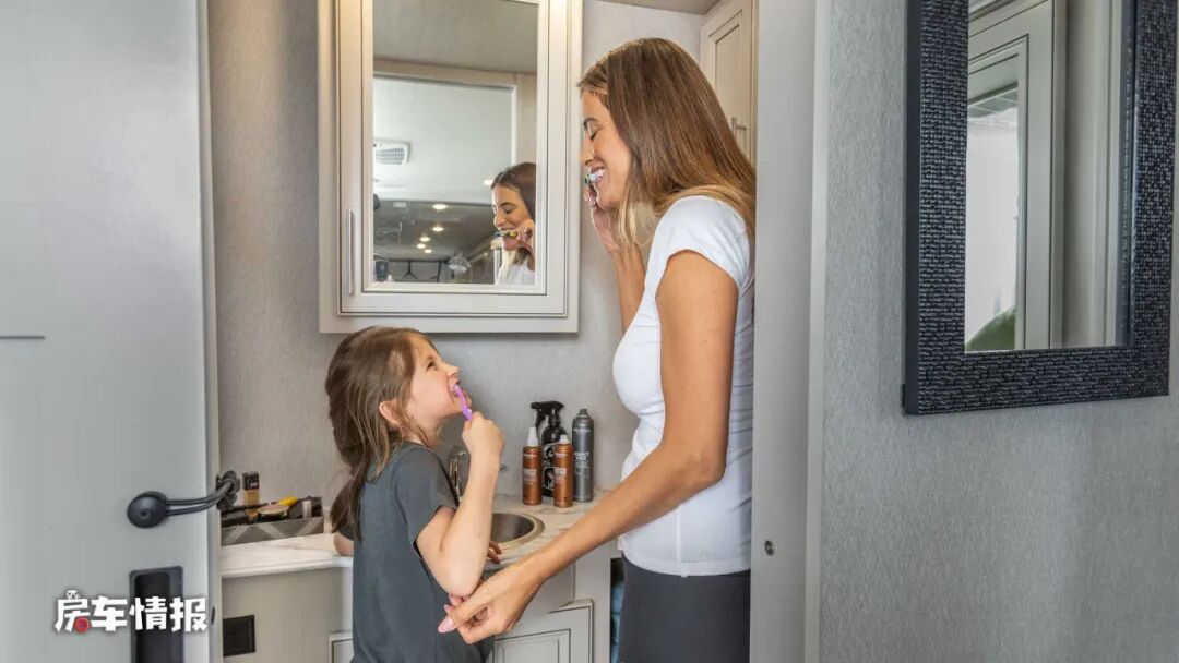 最后就是位于车厢尾部的独立卫浴室,得益于底盘的空间,整个卫浴室的面积还是非常宽敞的,并且采用了干湿分离的设计,提供了洗手台盆、马桶、淋浴花洒等设施,可以满足一家人的洗漱需求。