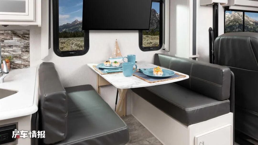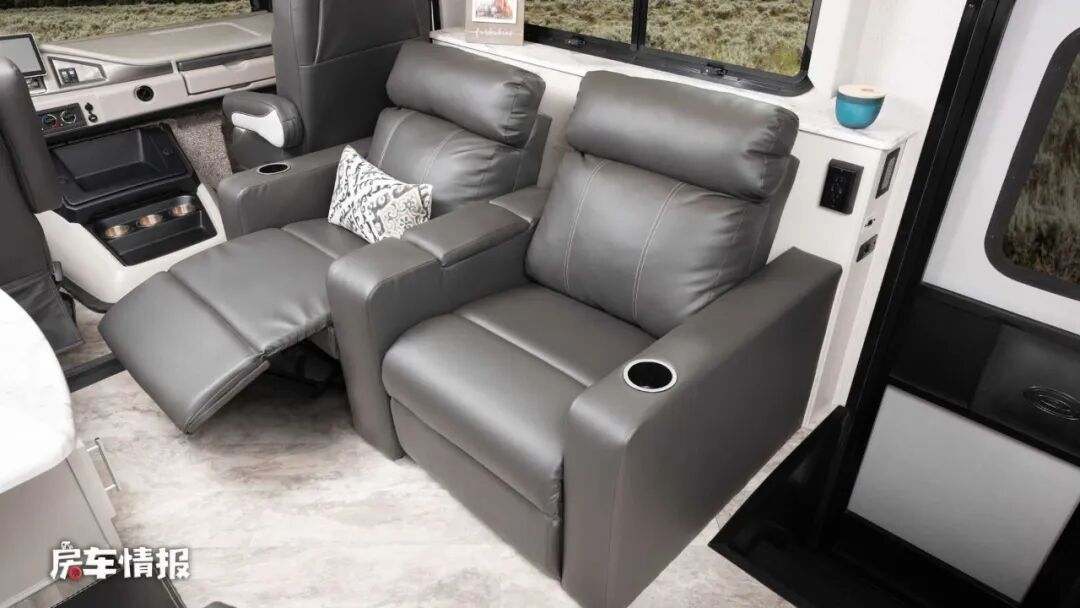 主驾驶座椅后方是以四人对卡座+餐桌组成的就餐区域,可以满足日常的就餐办公需求,旁边的墙壁上还悬挂了一台超大尺寸的电视,坐在这里看电视肯定不适合,但是坐在对面的两张单人沙发上还是挺不错,而且这两张沙发相比对卡座来说增加扶手和头枕,下方还带有腿托,整体填充的也更加厚实,坐起来也更加舒服。
