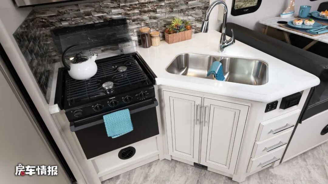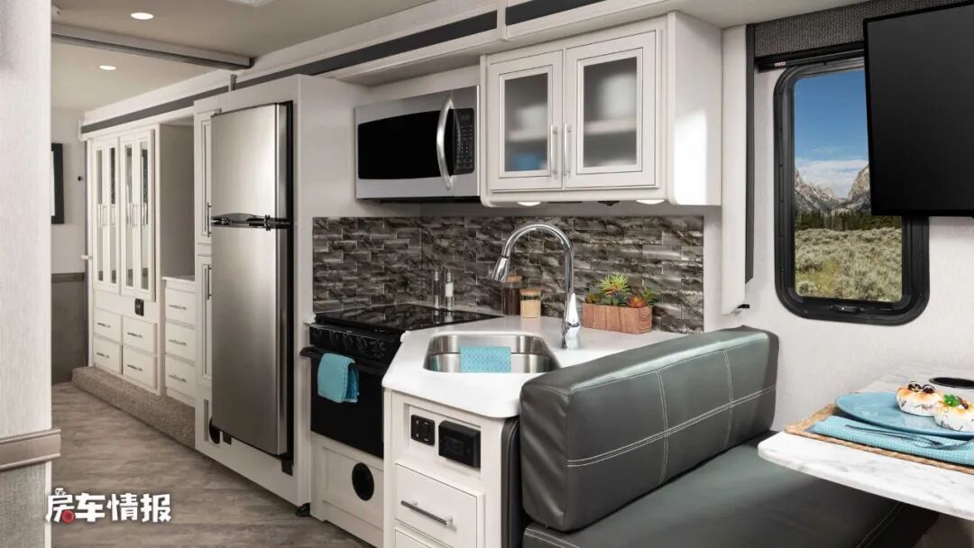 会客区后方是全车的厨房区域,整体的操作台尺寸还是比较不错的,台面上提供了带盖板的水槽、翻盖的多孔燃气灶,上方配置了微波炉,下方配置了烤箱,后方还有一台大容积的双开门冰箱,整体设计就和家里一样,完全能够满足日常的烹饪需求。