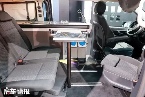 整辆车的内部其实和我们常见的大众T6露营车布局相差不多,驾驶室内的配置和颜值依旧在线,带有科技感的中控台能够为驾驶员提供便捷的操控性。
