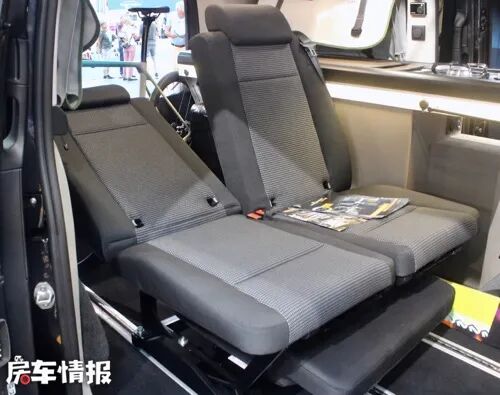 作为一款核载四人的车型,通过旋转主副驾驶座椅,可以与后排的双人联排座椅形成一个面对面的布局模式,而后方的双人座椅又都能够放平变成一张简易的双人沙发床,加上升顶内的双人床,这是一辆标准的四座四卧露营车。