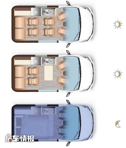 受限于车身尺寸,车内的布局较为紧凑,但却依然提供了两种不同的布局形式,第一种是四座模式,这时候车厢内部核载4人,驻车以后需要把主副驾驶座椅向后旋转,才能变成一个小型会客区。