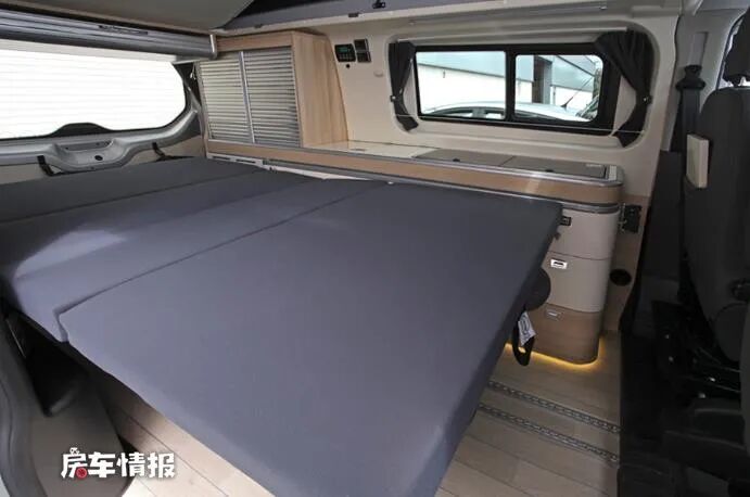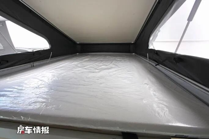 位于车厢顶部的升顶帐篷打开以后除了可以增加车内高度以外,在车顶可以变成一张尺寸约为1900*1350mm的双人床,同样可以满足2名成年人居住,如此这款车便可以满足一家4口人同时住宿的需求。