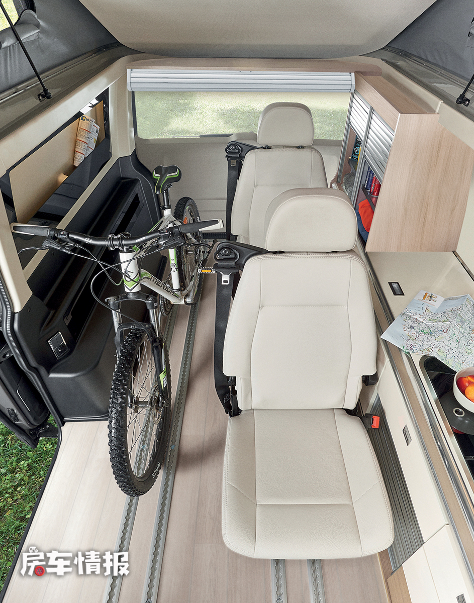 在四人座模式下,还可以选装一种前后纵置排列的座椅布局,此时生活区的空间会比较充裕,位于座椅一旁的空间,可以轻松放入一辆自行车甚至是带脚踏板的电动自行车也没问题,这对于整车的拓展能力有不小的提升。