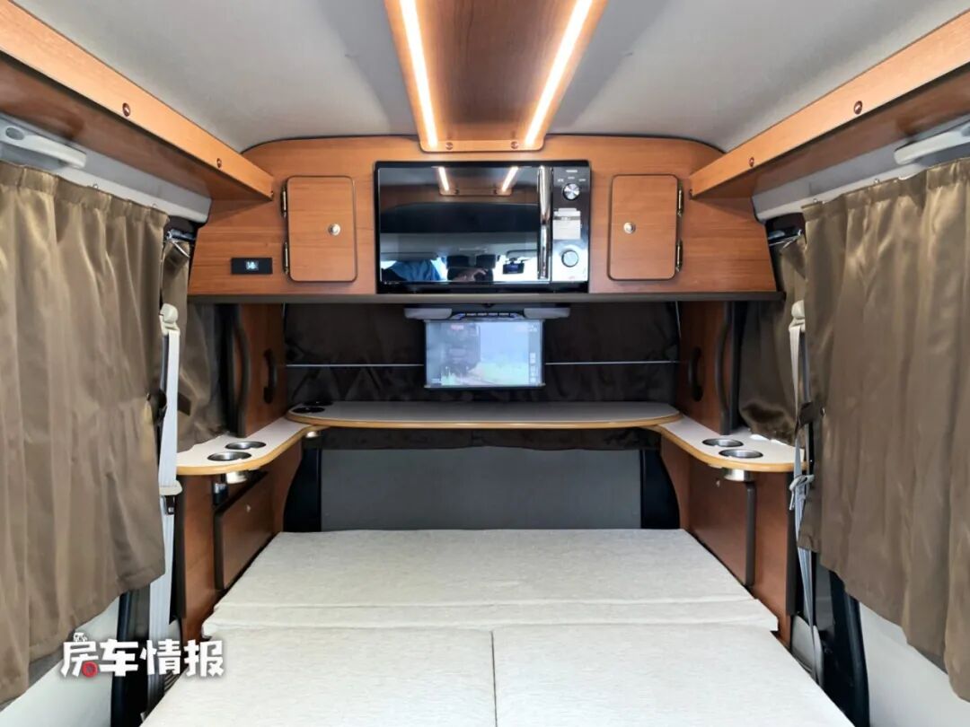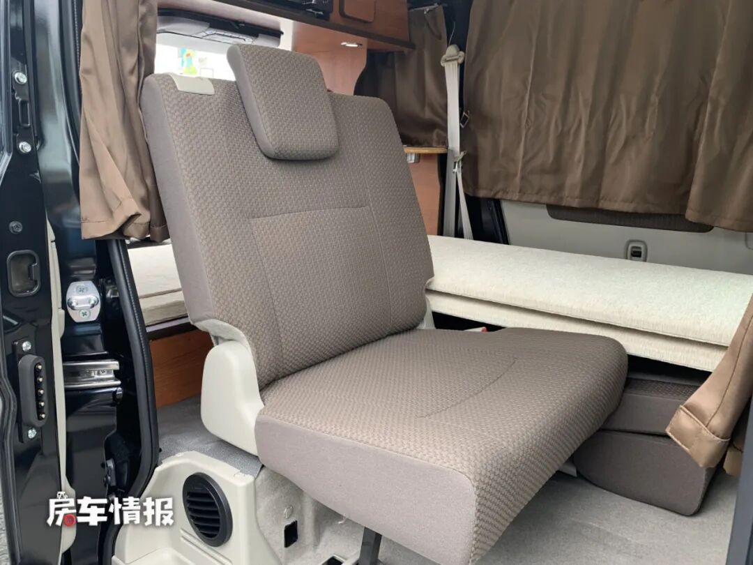 不过作为一辆床车来说,整体的设计还是比较简单的。车内饰提供了一张双人沙发,并且配有安全带,日常可以乘坐。沙发是采用布艺包覆的,所以日常乘坐起来更加的亲肤。