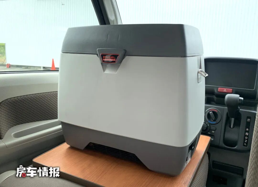 白天就餐的时候,可以将上方的台面打造成一个小型的餐桌椅,方便日常的就餐等需求,另外,这款车也提供了一台便携式的迷你车载冰箱,可以放几瓶饮料。